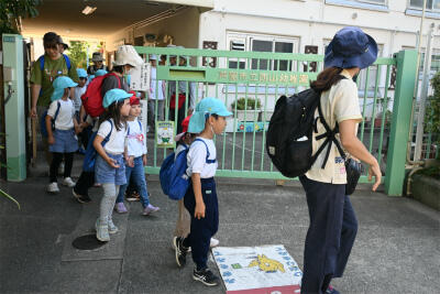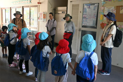 登山口を目指して、年少・年長ペアで出発です!年長すみれ組さんと一緒だと心強くて安心。
