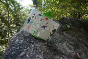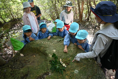 「イノシシのテーブル」では、今日も朝一番に登山者の方が石を並べた日付とイノシシのためにたくさんのドングリを置いてくださっていました。子どもたちは、「(ドングリが置いてあるなんて)本物のイノシシテーブルや!」と感激していました。