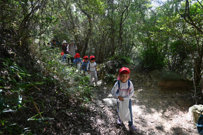 城山に到着すると、各クラスの歩くペースに合わせて、登りました。先頭を歩く年長すみれ組さんが、各名所に看板プレートを置いてくれるので、後から登ってくる年少いちご組は、見つける度に大喜び。それを目指して頑張って登ることができました。