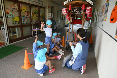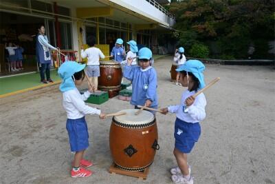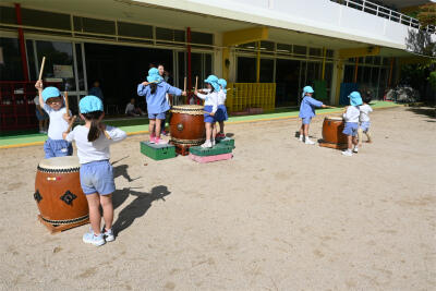 今日も、「にしやままつり」に向けて、年長すみれ組の元気な掛け声と和太鼓の力強い音色が園庭中響きました。