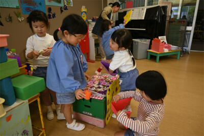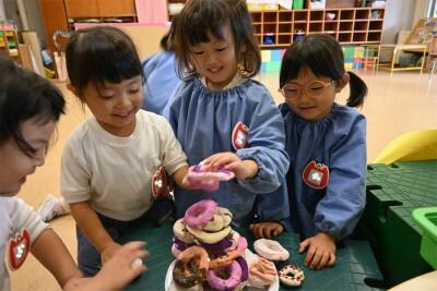 「いらっしゃいませー!」「おいしいドーナツはいかがですか?」「これください」とお店やさんごっこのやりとりを楽しんでいました。