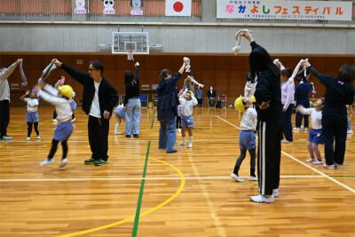 今日は、市内の公立幼稚園5園の年長組の子どもたちと保護者の方が、芦屋市立体育館に集まって、一緒に体を動かすことを楽しみました。