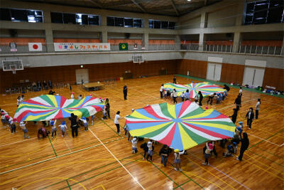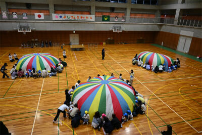 60組の親子が、みんなで気持ちを合わせてパラバルーン。