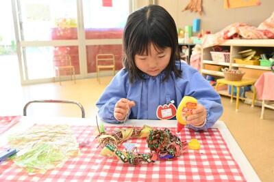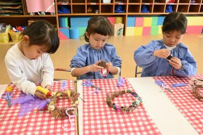年少いちご組では、アサガオのツルを使ったリース作り。リボンやモール、秋の実など色々な素材を自分で選んで、飾りつけを楽しんでいました。黙々と真剣なこの表情‥‥「ここに、こんなふうにつけたい!」と思いやアイデアがいっぱいです。