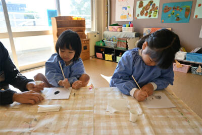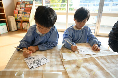 年長すみれ組では、今日とれたてのザクロの絵を、割りばしペンを使って墨汁で描いていました。