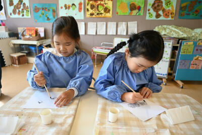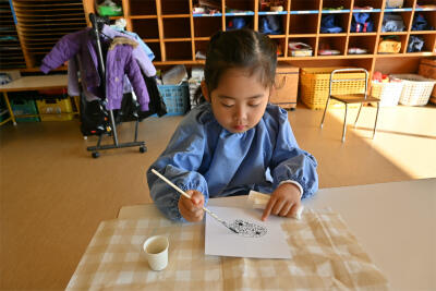 さすが、年長組さん。細かいザクロの赤い粒の実を、一つ一つ描くことを楽しんでいました。