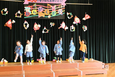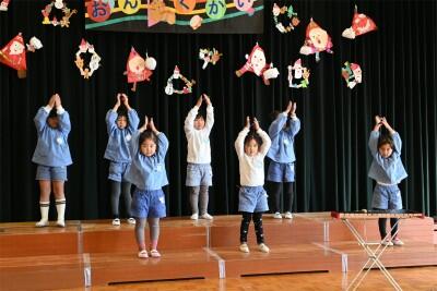 次は、年少いちご組の演奏の番です。お気に入り、大好きな「ゆらりポーズ」。今日もばっちり決まりました。