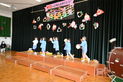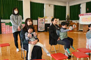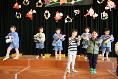 歌や合奏を披露した後、さんさんひろばのお友達も、いちご組さんと一緒に楽器遊びを楽しみました。