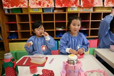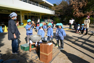今日は、お餅つきをしました。朝早くから給食室で、もち米を大きなせいろで蒸しました。蒸しあがりを楽しみに、子どもたちは元気いっぱい「おもちつき」の歌を歌います。♪ぺったんこ それ ぺったんこ~