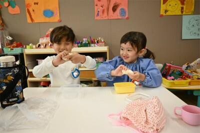 「こんなに伸びるよ!」伸ばしたり丸めたりして、きな粉をかけて、食べました。