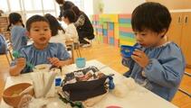 そして、精道こども園に着き、お家の方にもご協力いただいた、みんなの思いのこもった千羽鶴を届けました。