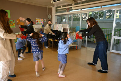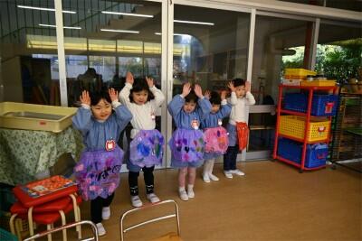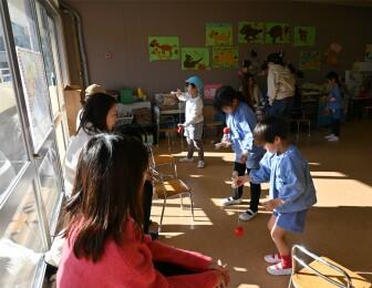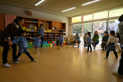 たっぷり体を動かした後は、各保育室で、劇遊びやこま・けん玉遊びを見ていただきました。