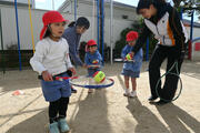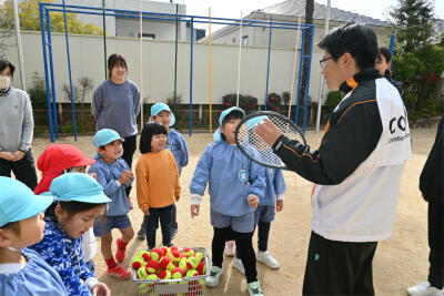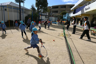 参観の後は、テニスのコーチにお越しいただき、テニス体験を行いました。子どもたちも、興味津々です。