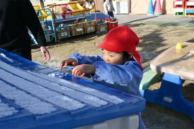 今朝、「さむへちゃタイム」で園庭に出てみると‥‥園庭のあちらこちらに、うっすら雪が積もっていました。子ども達は、大喜びです。