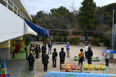 その後、総合訓練会場へと移動し、減災・防災の取り組みを体験したり、炊き出しをいただいたりしました。西山幼稚園でも、毎月、「自分の命を守る」ことを大切に、避難訓練を行っています。今日のように、地域が一致団結してつながり合って、訓練を実施されることを、とても心強く感じました。