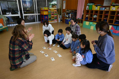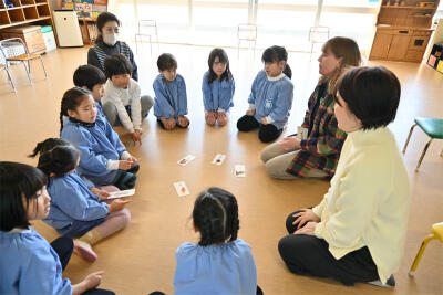 大好きなカルタ遊び(英語バージョン)を、講師の先生からヒントをもらいながら、楽しんでいました。