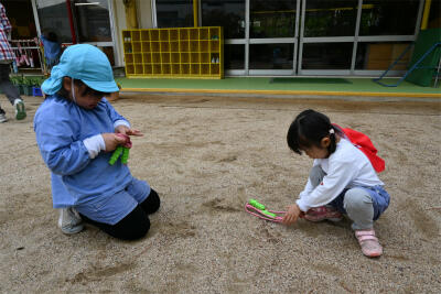 そして、体操の後は、ペアの年長すみれ組から、縄の結び方を教えてもらいました。