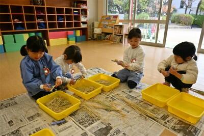 朝、いちご組さんの保育室をのぞいてみると‥‥なにやら田んぼで育てた稲の藁を、はさみで切っていました。