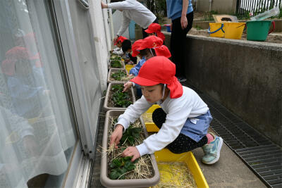 「苺が大きく育つように、お布団にするの!」と自分で育てている苺の苗にそっと藁を敷きました。「早く苺ができないかな‥」と毎日楽しみにお水やりもしているいちご組さんです。年長組になって、収穫が今からとても楽しみですね。