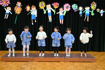 そして、明日がいよいよ修了式。すみれ組さんの卒園式のように、ひな壇の上に立って、1年の思い出を振り返りながら、ちょこっと歌を歌ったりお話をしたりします。体でリズムを感じながら、元気いっぱい歌っていました。