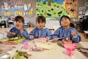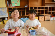 今日がいちご組最後のお弁当日でした。特別に憧れのすみれ組の保育室で、みんなでお弁当パーティーをしました。