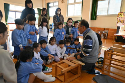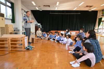 今日は、丹波年輪の里から、たくさんの木のおもちゃをお貸しいただき、木育アドバイザーの方から「木のお話」もお聞きしました。そして、ノコギリやカンナなどで木を切る・削る実演も見せてくださいました。