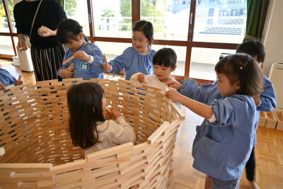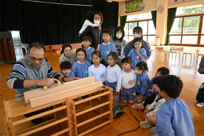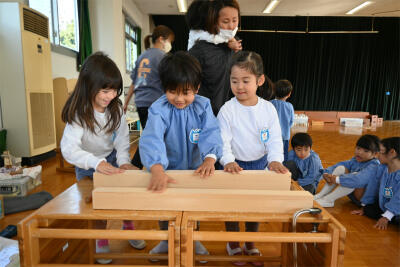 昨日、木工を楽しんだ年長すみれ組さんも、初めて見る年少いちご組さんも、興味津々です。