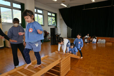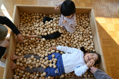 お話をお聞きした後は、色々な種類の木でできた、魚釣りや、木のボールプールなど、木の香りや感触を楽しみながら遊びました。