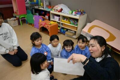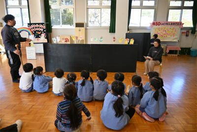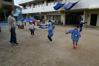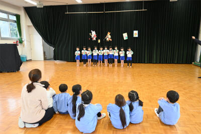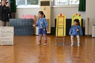 たっぷり体を動かした後は、各保育室で、劇遊びやこま・けん玉遊びを見ていただきました。