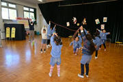 すみれ組では、「はなのすきなうし」の牡牛になって、牧場を元気いっぱい駆け回ります。