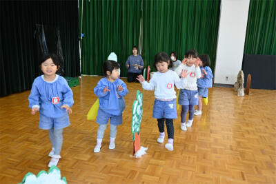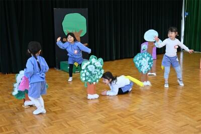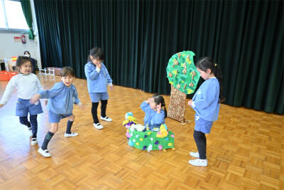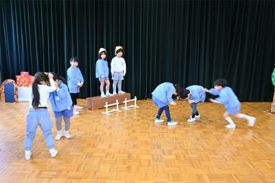 今日は、芦屋川ナーサリーの5歳児、ぞう組さんが、西山幼稚園に遊びに来てくれました。遊戯室ですみれ組と一緒に、ステップをして遊びました。