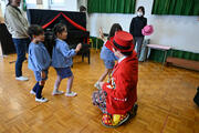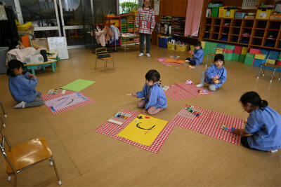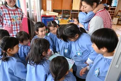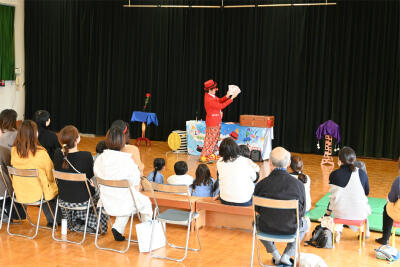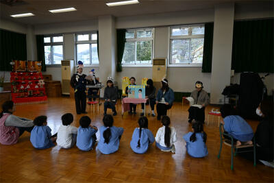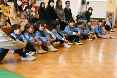 子どもたちは、西山幼稚園を舞台に繰り広げられる、うさぴょんとくろちゃんの冒険物語に、興味津々で見入っていました。