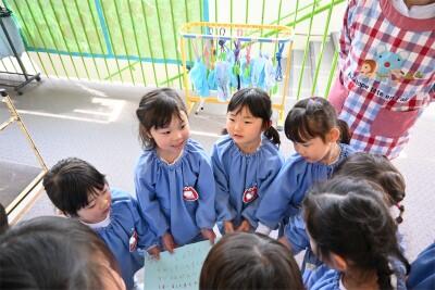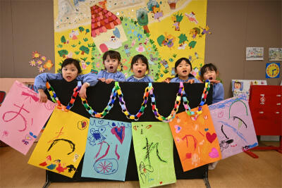 明日は、年少いちご組が、年長すみれ組を招待して、お別れ会です。すみれ組さん、明日、楽しみに来てくださいね。